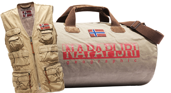 ALDIS, une veste sans manches structurée en coton teinte dans un style vintage, signée NAPAPIJRI. Très fonctionnelle grâce à sa taille réglable et à ses poches pratiques avec fermeture zippée renforcée en métal, ses plusieurs poches plaquées fermées par bande auto-agrippante, elle sera l’idéale pour vous expédition en terres inconnues… Prix : 209 €. Sac BERING, iconique sac week-end, doté de poignées renforcées en cuir suédé. Ce modèle, doté de l’inimitable inscription Napapijri avec son effet vieilli apportera un style vintage très tendance. Prix : 110 €