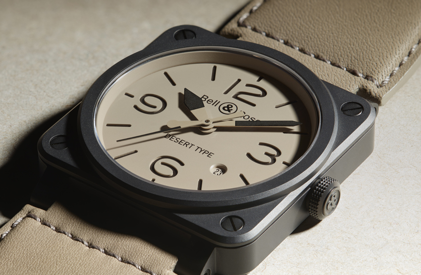 Coup de cœur pour la dernière Bell & Ross. La BR 03 DESERT TYPE est la montre militaire – et de caractère – par excellence conçue pour les interventions de l’aviation dans les pays chauds. Elle répond aux exigences de l’armée de l’air : précision, lisibilité, fonctionnalité et étanchéité. J’ajouterai discrétion et élégance et une séduisante création qui ravira les baroudeurs et les esprits désireux d’originalité. Le boîtier carré est traité en céramique teintée noire dans la masse et un verre en saphir haute résistance est antireflets. La lisibilité maximale du cadran est accentuée par le choix typographique et la taille des aiguilles, mais surtout par la construction même du cadran, composé de deux plaques superposées, la supérieure beige découpée à l’emplacement des chiffres et index pour laisser apparaître la plaque inférieure recouverte de revêtement photoluminescent noir. Un contraste de couleurs et un relief qui offrent une lisibilité optimale de jour comme de nuit. Déclinée en trois versions (de 42 et 39 mm), la nouvelle Bell & Ross offre, dans sa version la plus complète (BR-03-94), un mouvement automatique, les fonctions heures, minutes, petites secondes à 3 h, date, compteur 30 min au centre. Notez que le modèle 39 mm, BR S Desert Type est équipé d’un mouvement à quartz.